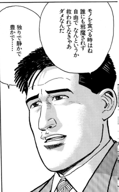 ──時間や社会に囚われず、幸福に空腹を満たす時、つかの間、彼は自分勝手になり自由になる。誰にも邪魔されず、気を使わずものを食べるという孤高の行為。この行為こそが現代人に平等に与えられた、最高の癒しと言えるのである。──